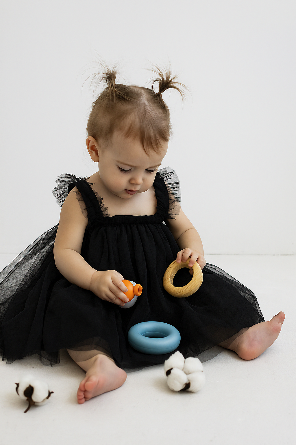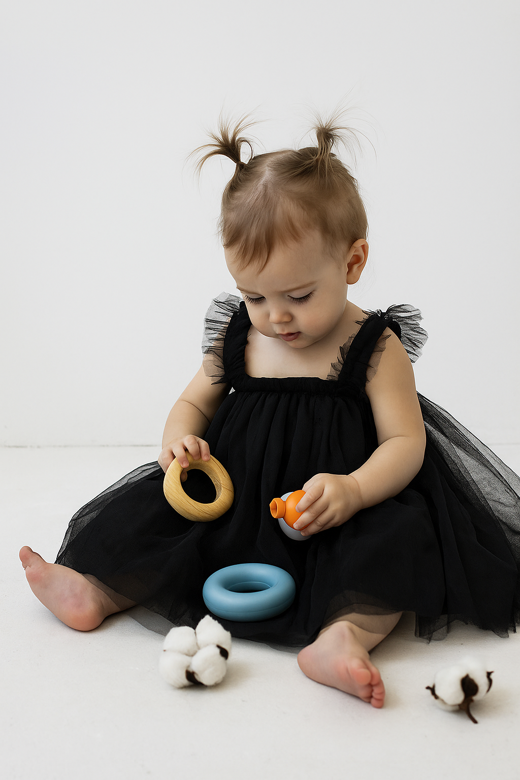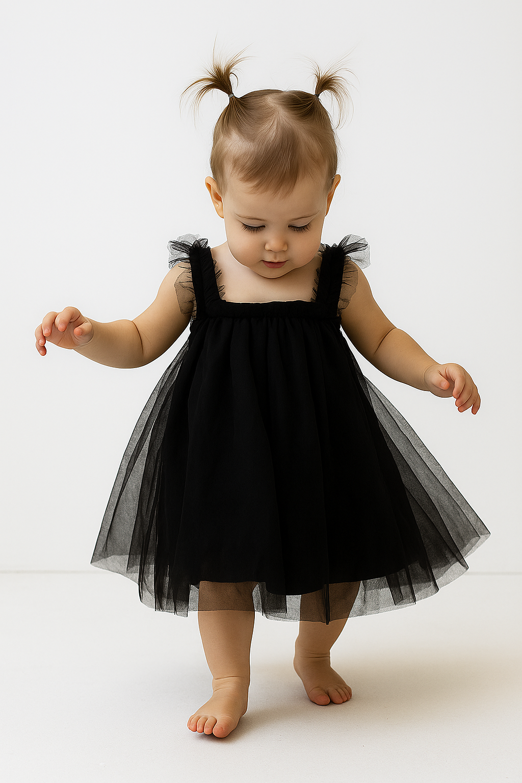 This enchanting dress is perfect for making your little one the star of any celebration. The classic black color with tulle detailing ensures your baby looks elegant and adorable at parties, family gatherings, or special photoshoots.