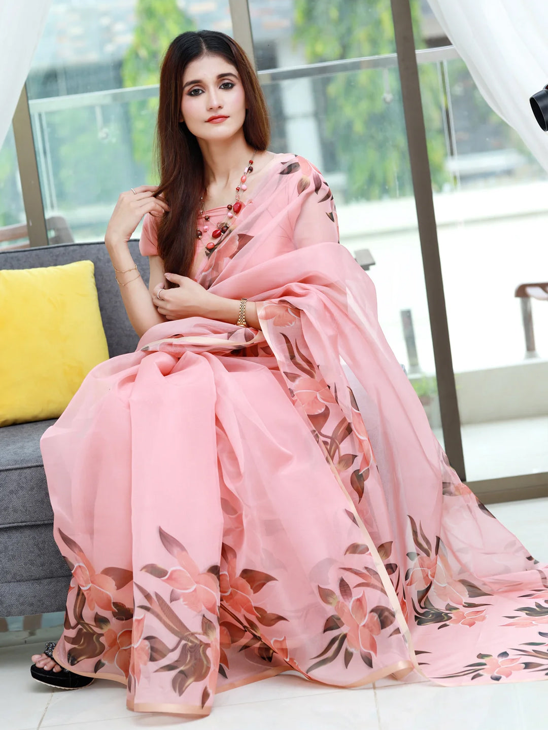 Discover the perfect blend of elegance and nature-inspired beauty with this stunning peach organza saree featuring delicate leaf motifs. This exquisite piece captures the essence of feminine grace with its soft peach hue and artistic botanical prints.