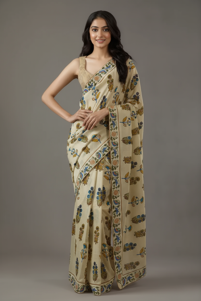 Elevate your ethnic wardrobe with this exquisite beige silk blend saree featuring intricate floral motifs in earthy tones of gold, blue, and green. The delicate printed border adds a touch of traditional elegance, making it perfect for festive occasions, weddings, and special celebrations.