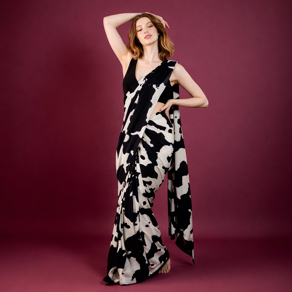 Make a bold fashion statement with this stunning black and white cow print silk blend saree. The trendy animal print pattern creates a contemporary and eye-catching look, perfect for those who love to express their unique style with confidence.