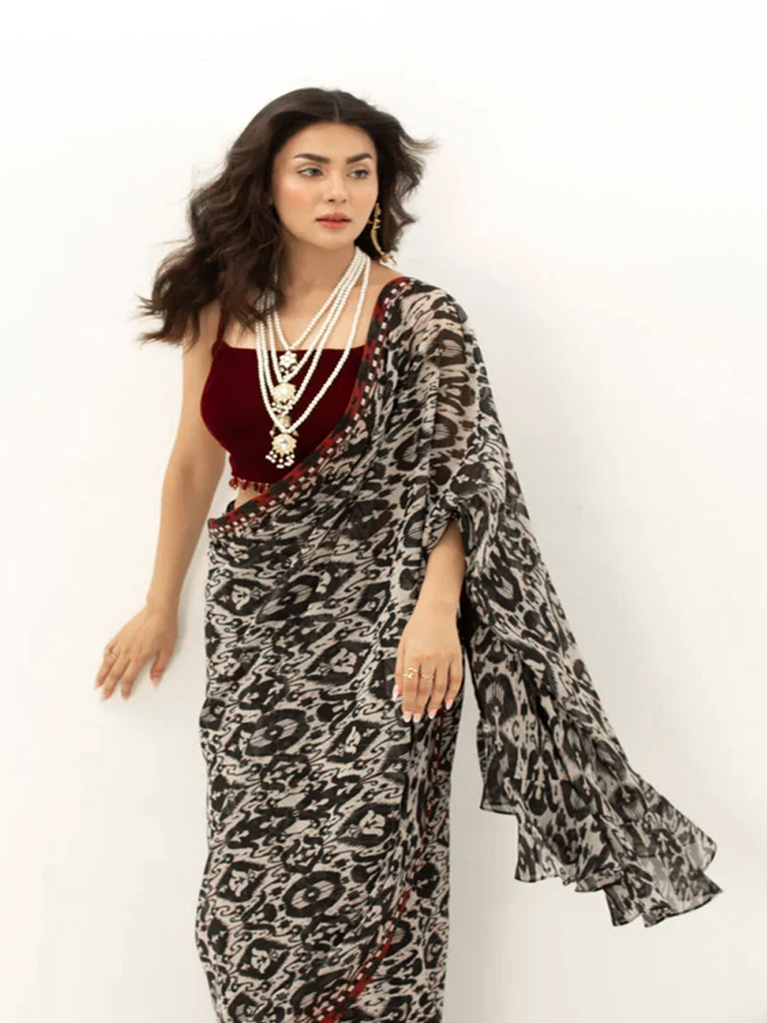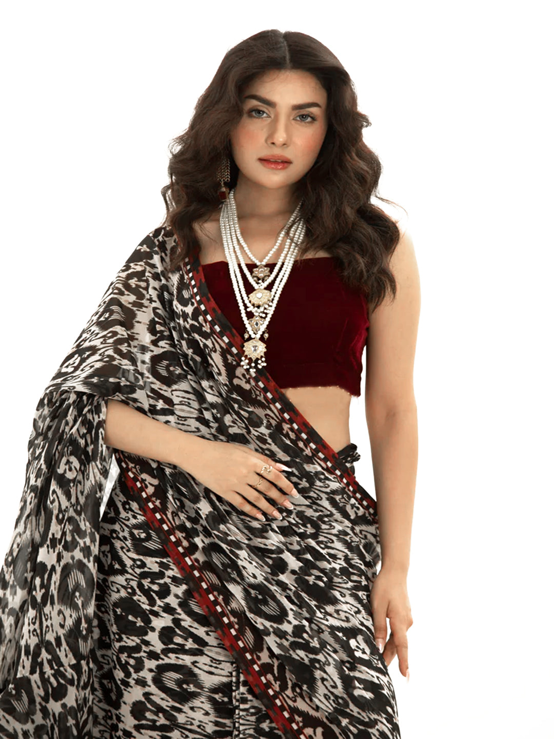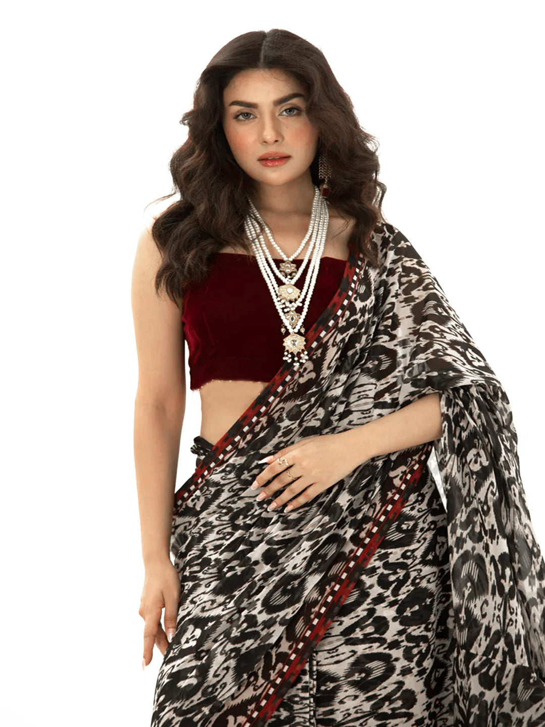 Step into sophistication with this classic black and white ikat saree. The timeless monochrome palette paired with the rich maroon blouse creates a striking contrast that's both modern and traditional, making it perfect for the contemporary Indian woman.