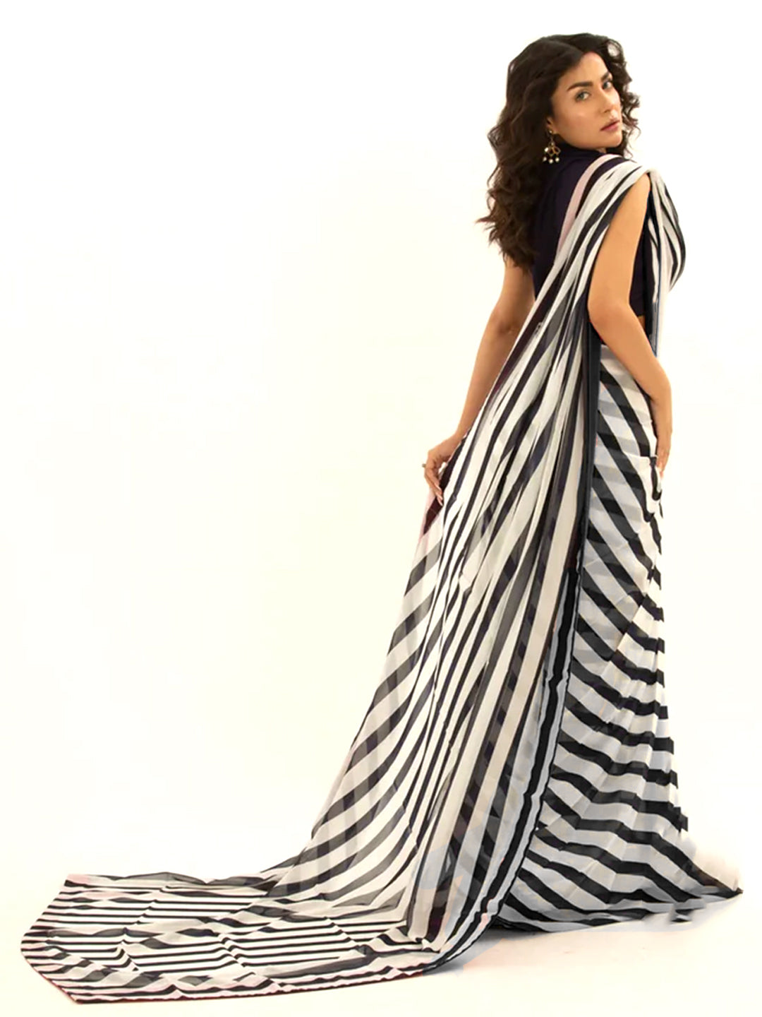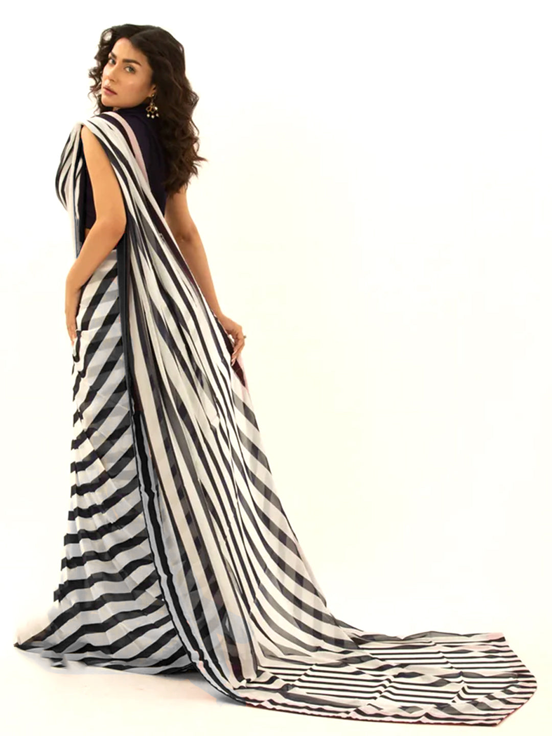 Black & White Striped Silk Blend Saree – Modern Party Wear
