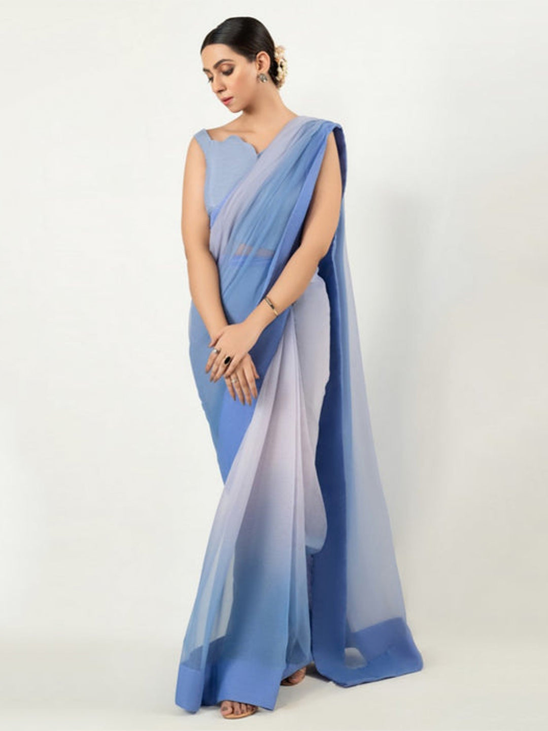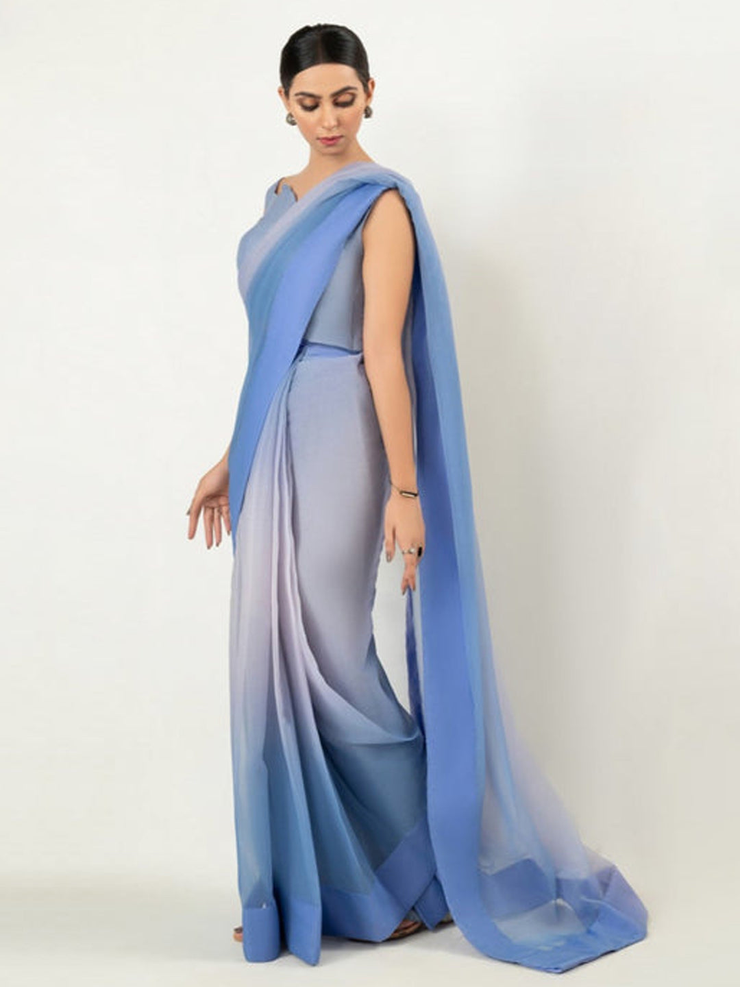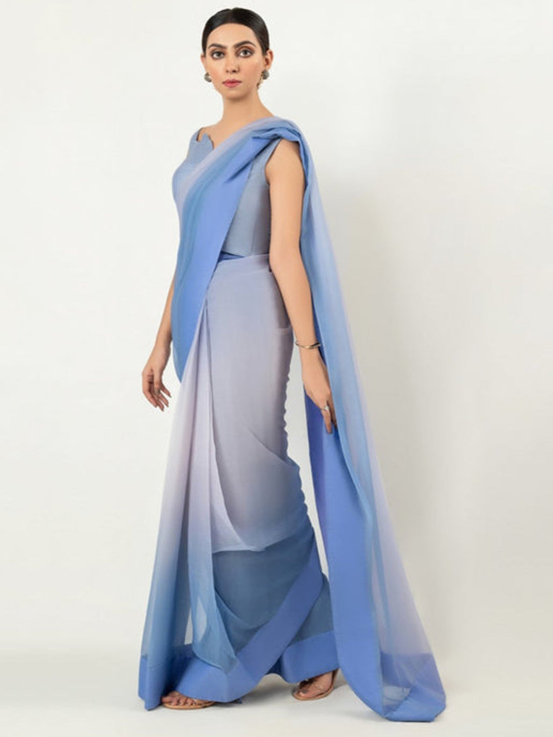 Step into elegance with this stunning blue gradient saree that transitions beautifully from deep blue to soft lavender. The flowing fabric creates a mesmerizing ombre effect that catches light beautifully.
