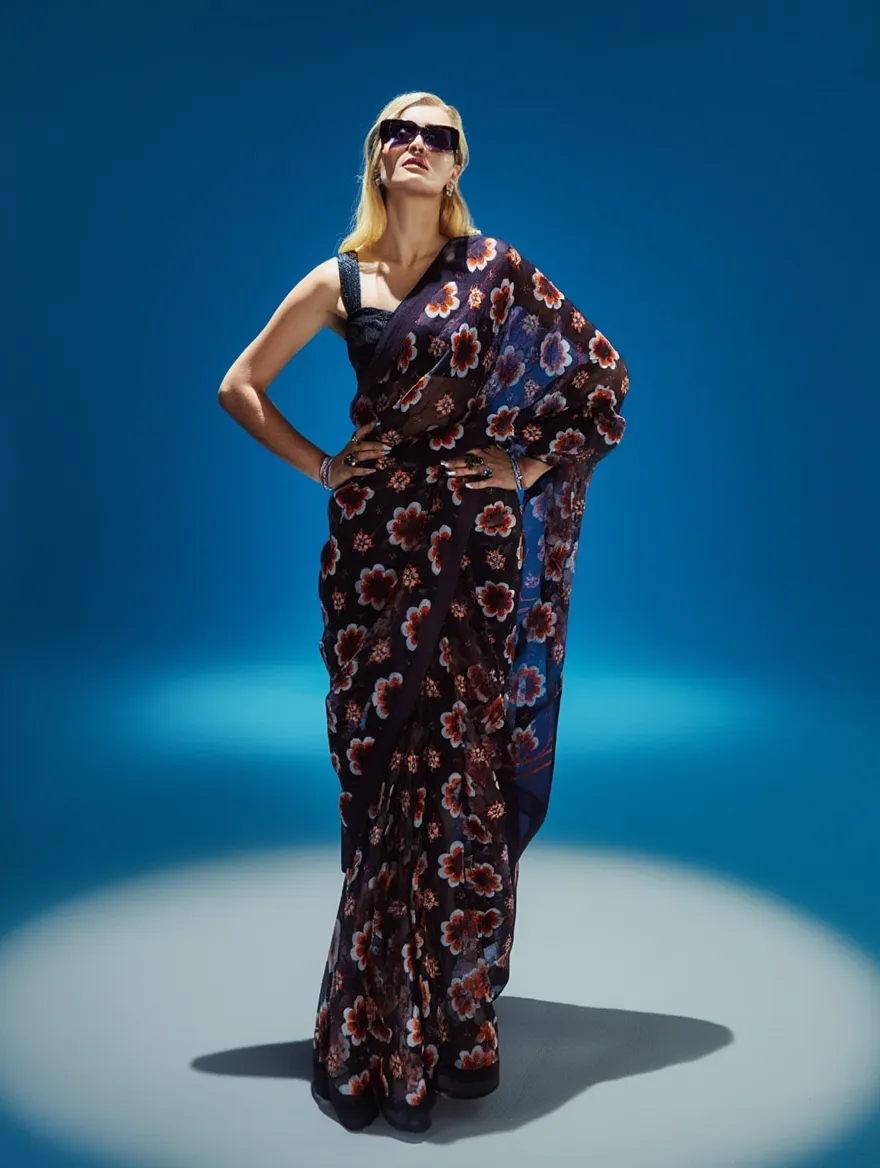 Express your refined style with this premium silk blend saree that combines rich colors with elegant floral design.