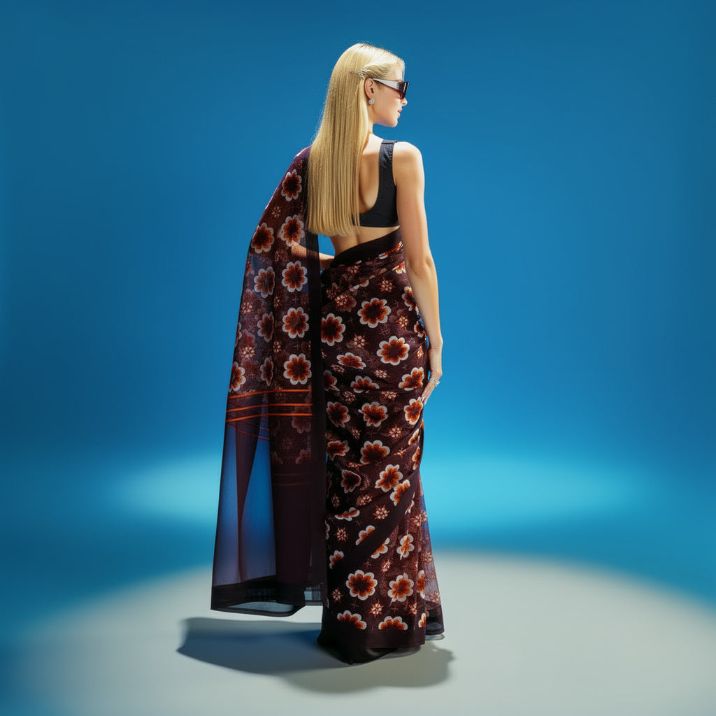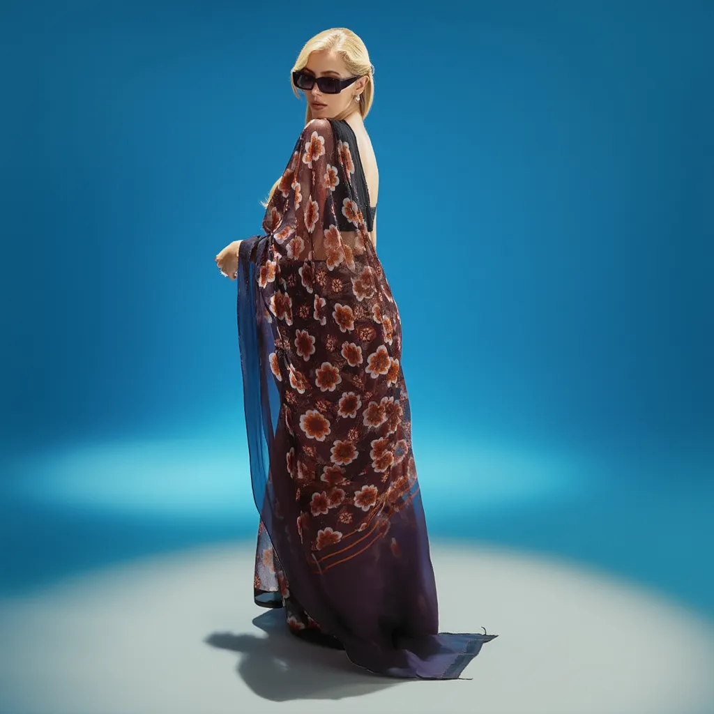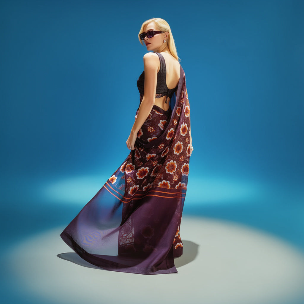 Embrace sophisticated elegance with this stunning dark purple floral printed silk blend saree. The delicate floral motifs in coral and multicolor tones against a rich purple base create a refined and contemporary look, perfect for making a graceful statement at any occasion.