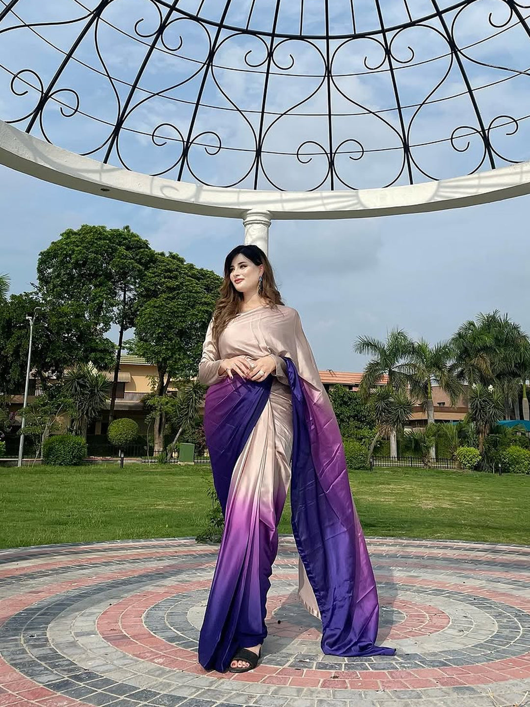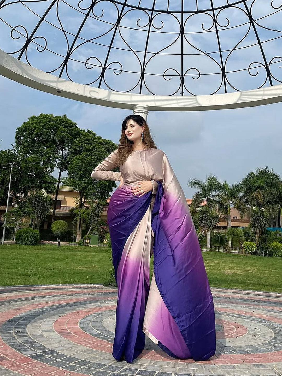 Experience royal elegance with this stunning beige to purple gradient satin silk saree that showcases a beautiful ombre transition from soft beige to rich purple tones. This sophisticated piece combines warm neutral shades with regal purple hues for a truly captivating look.