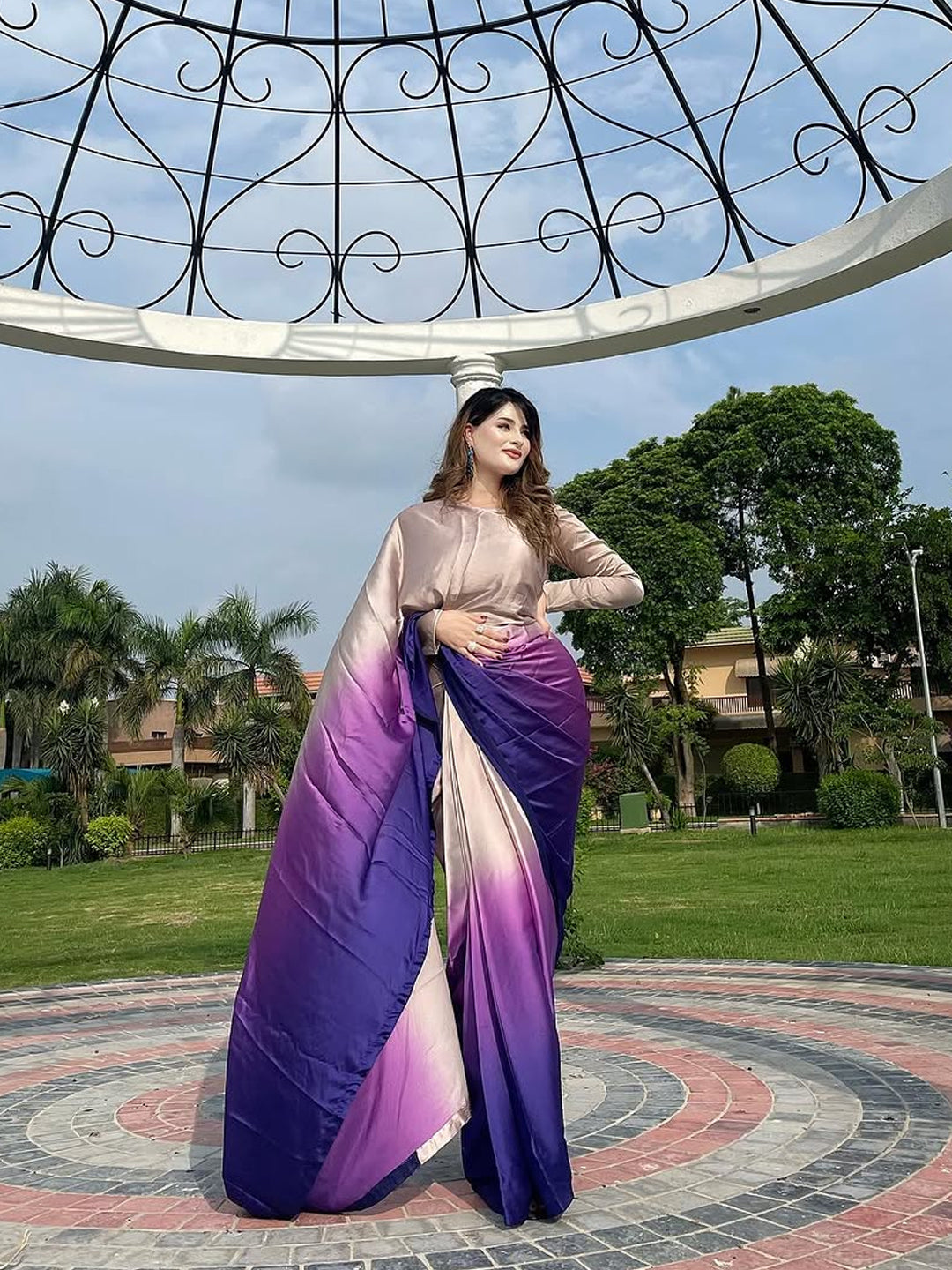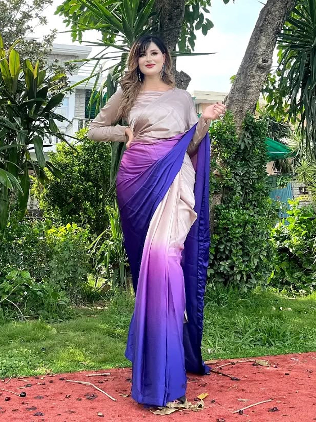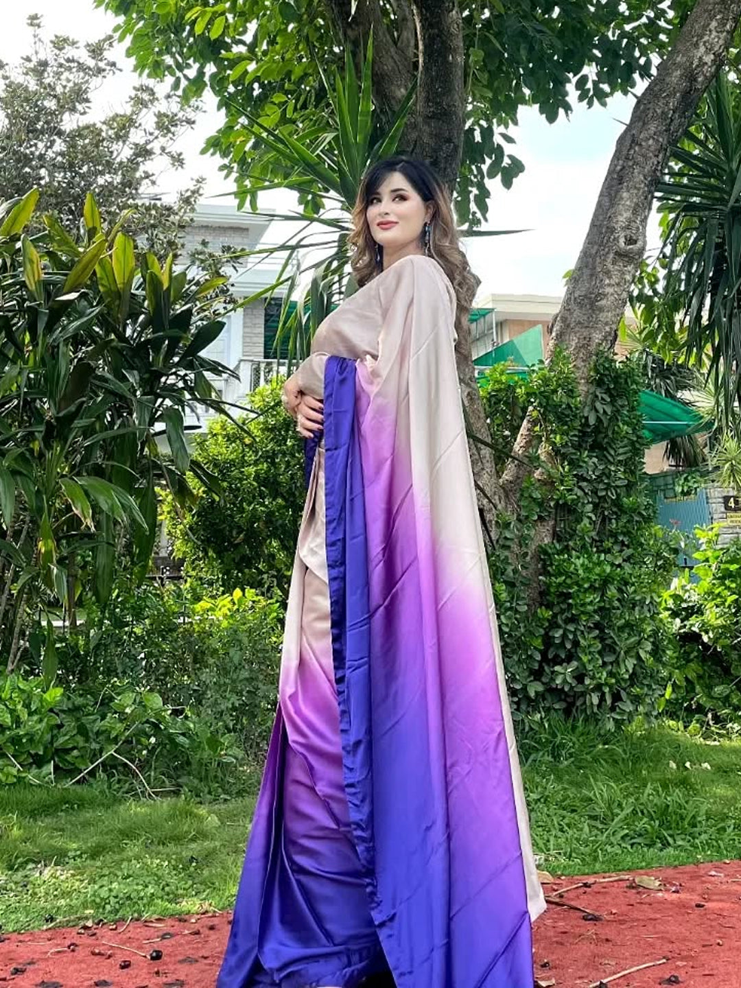 Elegant Beige to Purple Gradient Satin Silk Saree - Ombre Designer Drape