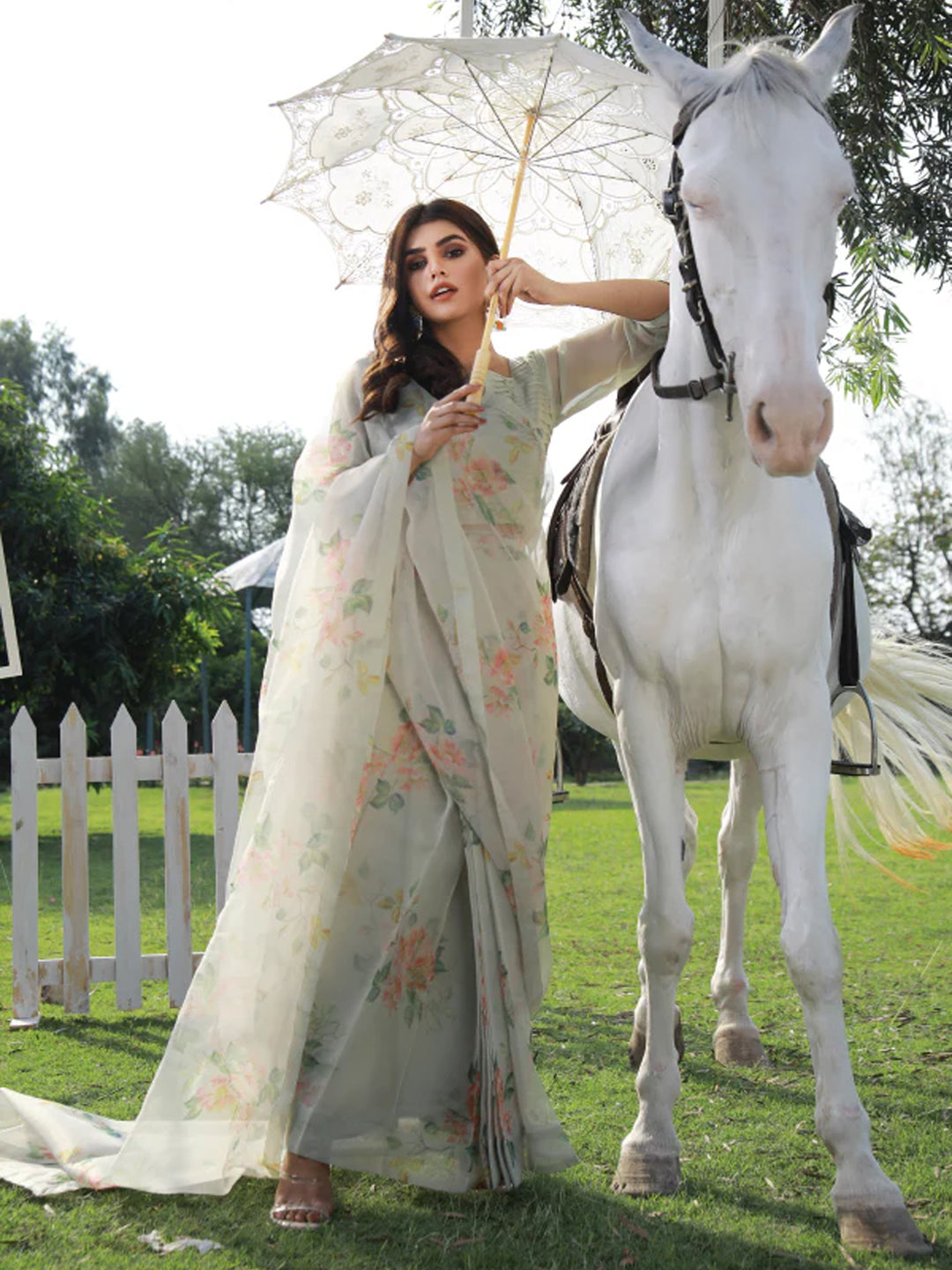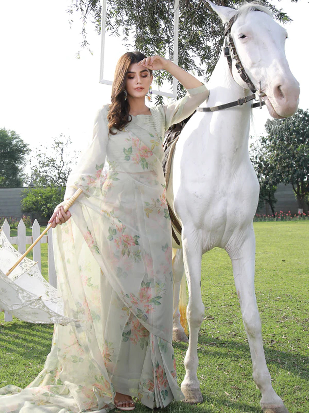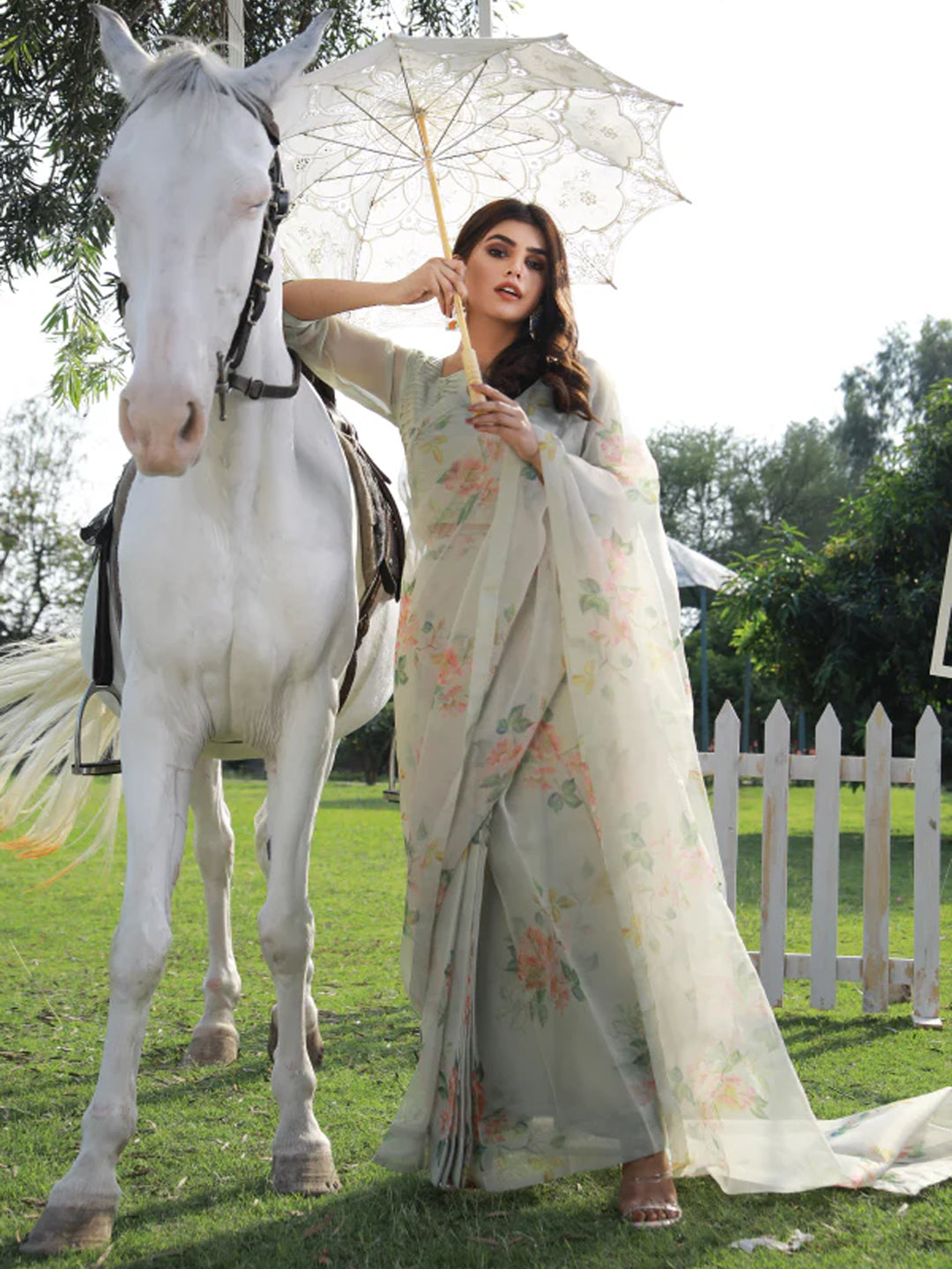 Elegant Floral Organza Saree - Light Grey with floral Print