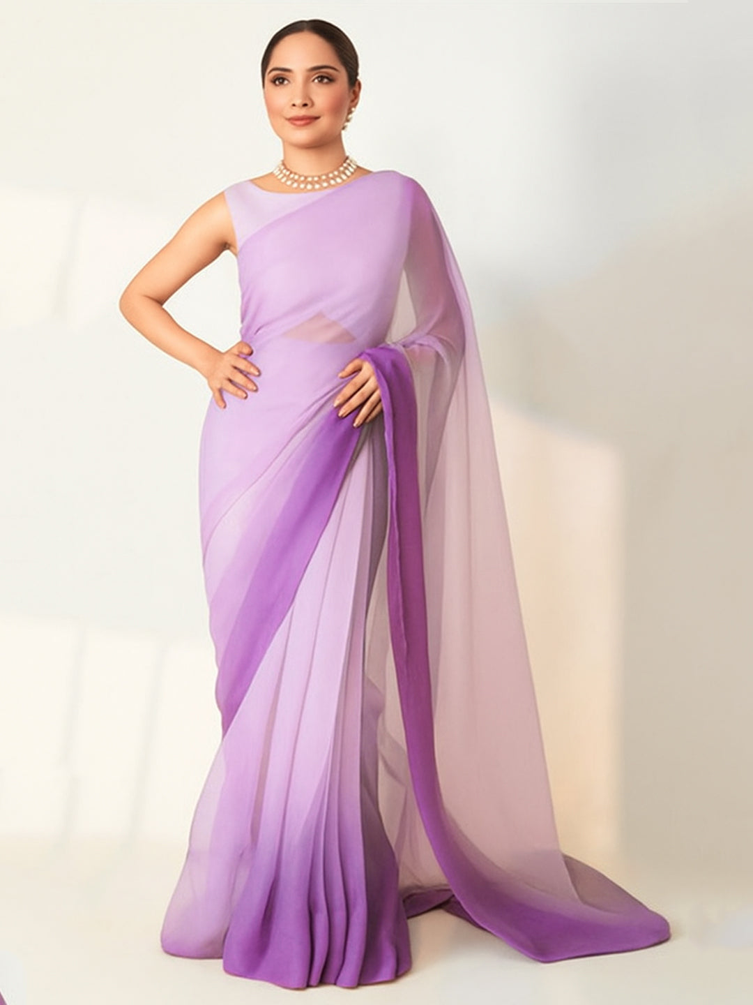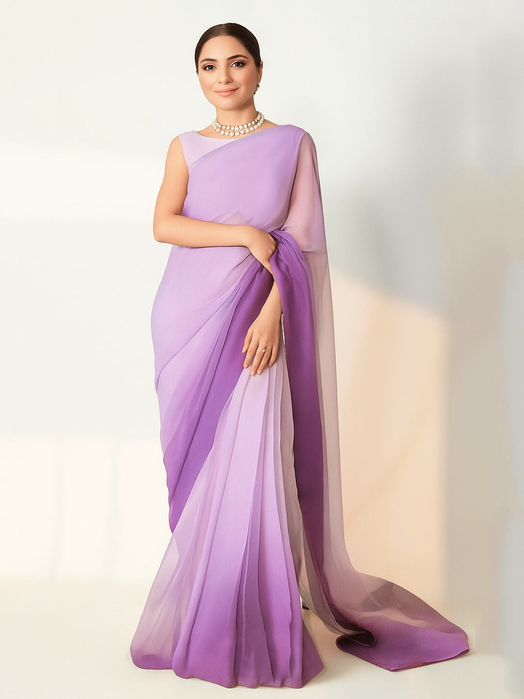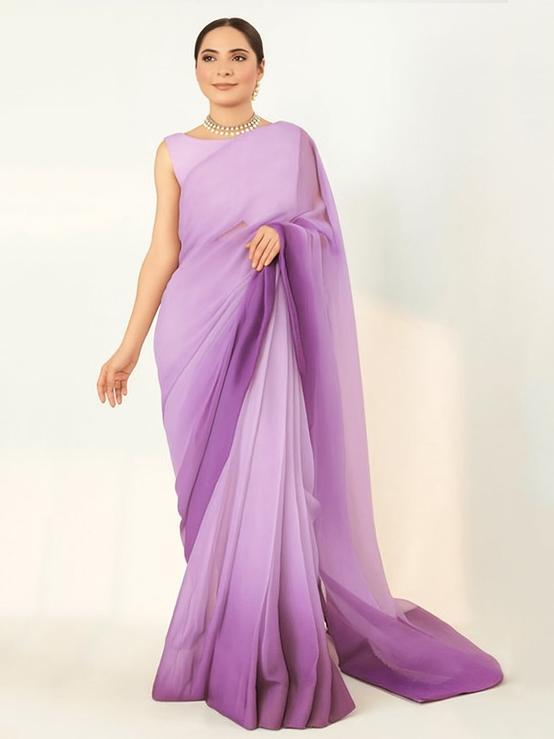 The soothing lavender blends seamlessly into deep purple, creating a mesmerizing ombre effect that catches the light beautifully. Paired with a sleek sleeveless blouse, this ensemble is perfect for weddings, cocktail parties, festive celebrations, or evening gatherings.