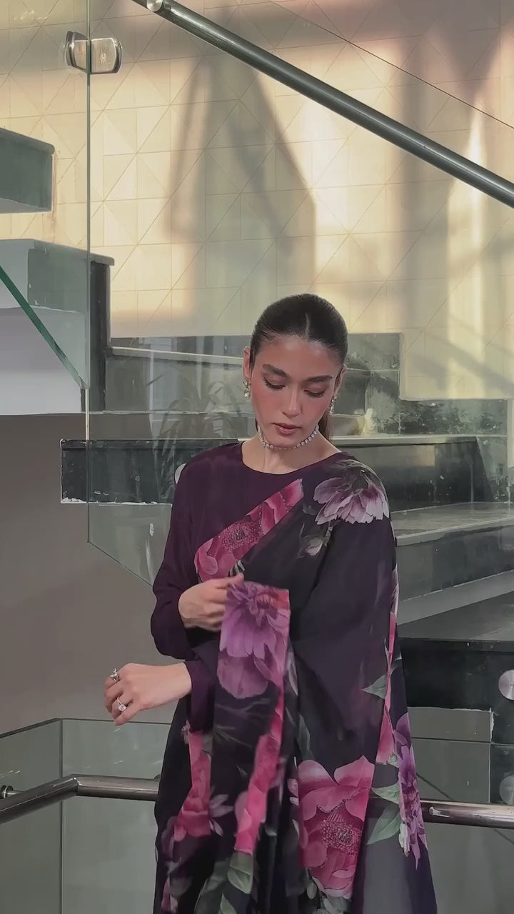 Embrace royal elegance with this exquisite purple silk blend saree featuring vibrant pink and green floral motifs. Perfect for weddings and special celebrations.