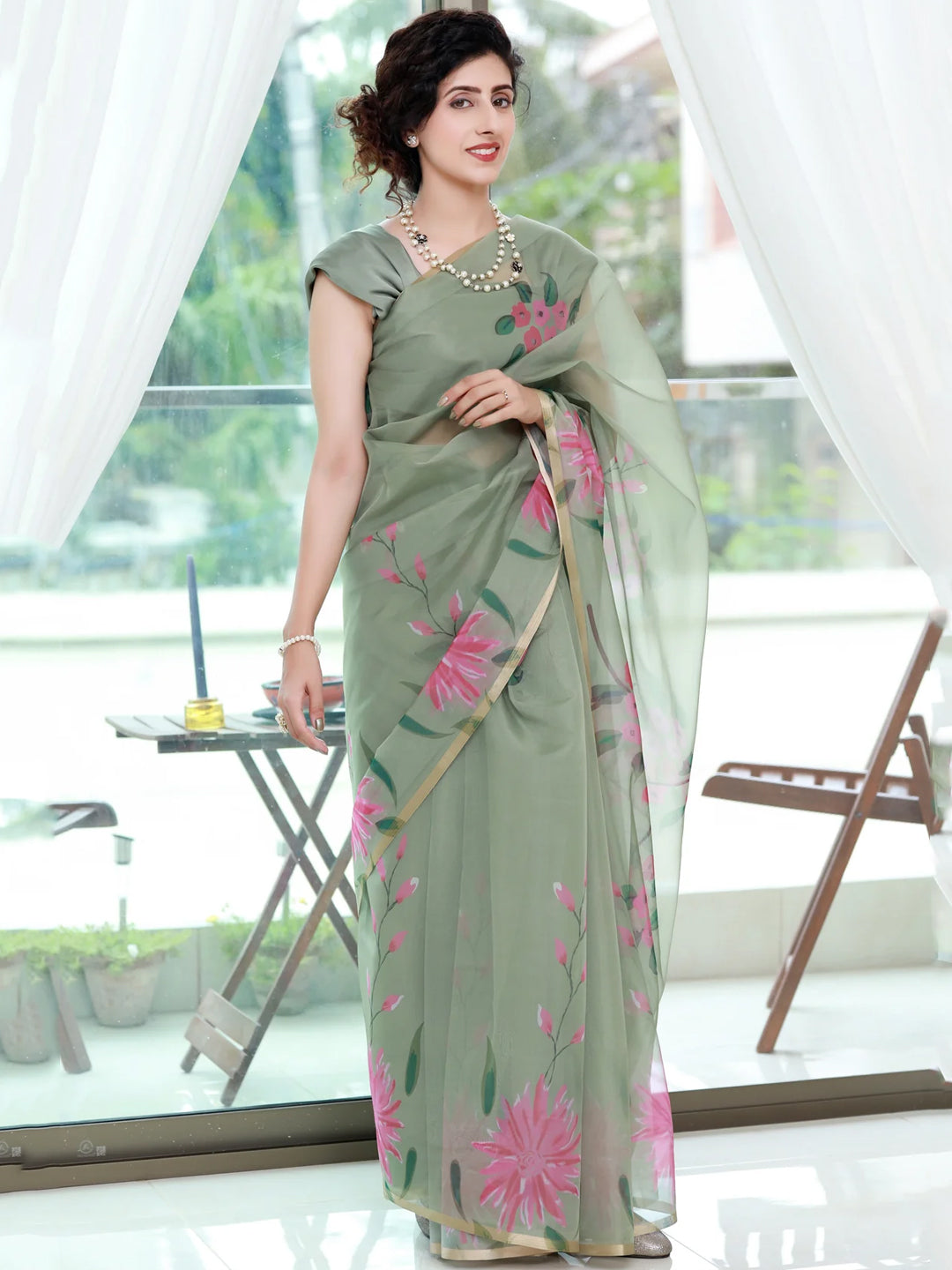 Elegant Sage Green Organza Saree - Pink Floral Print