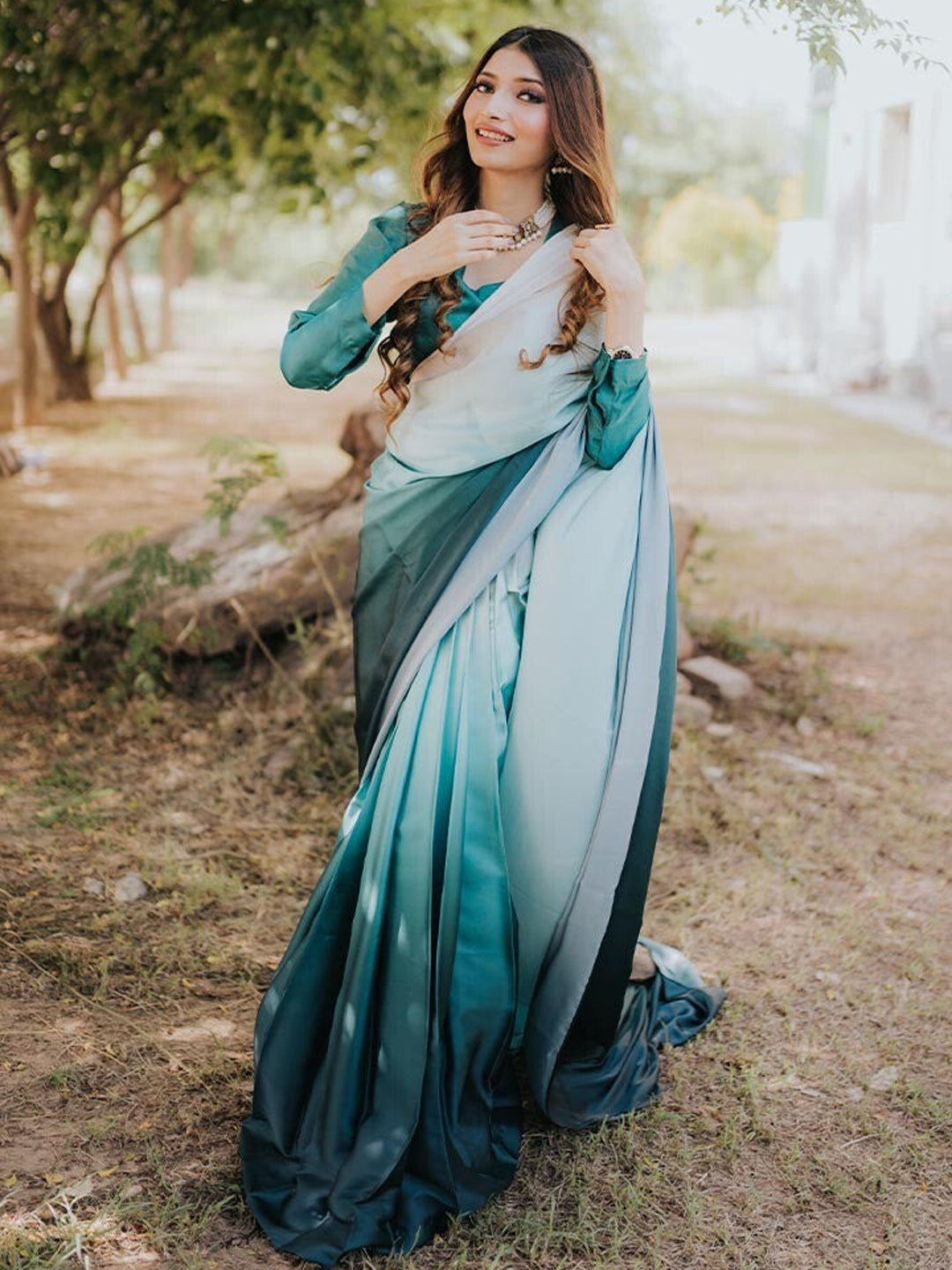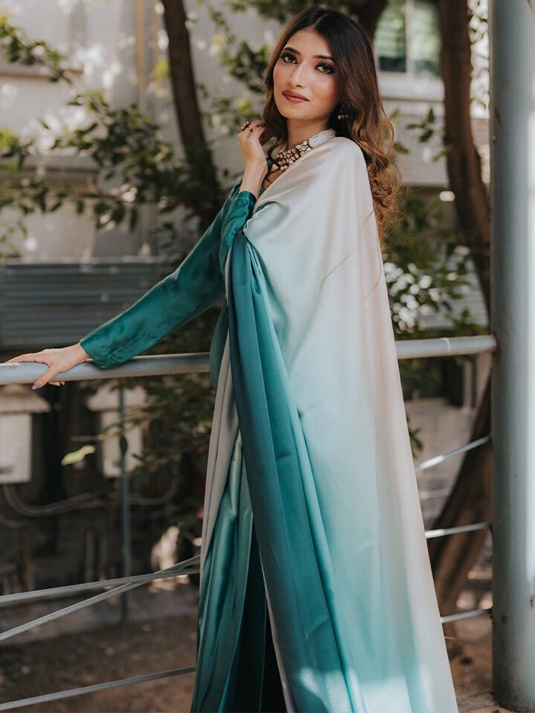 Elegant Teal Gradient Satin Silk Saree - Ombre Designer Drape