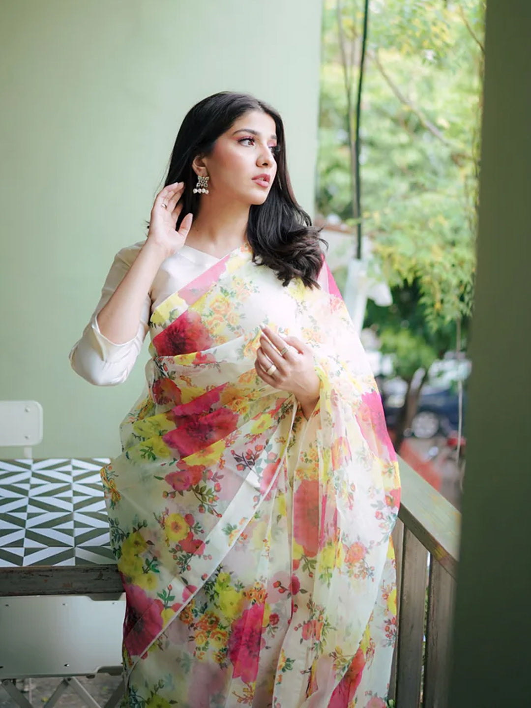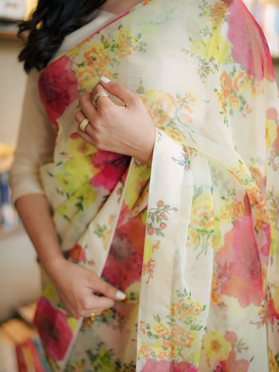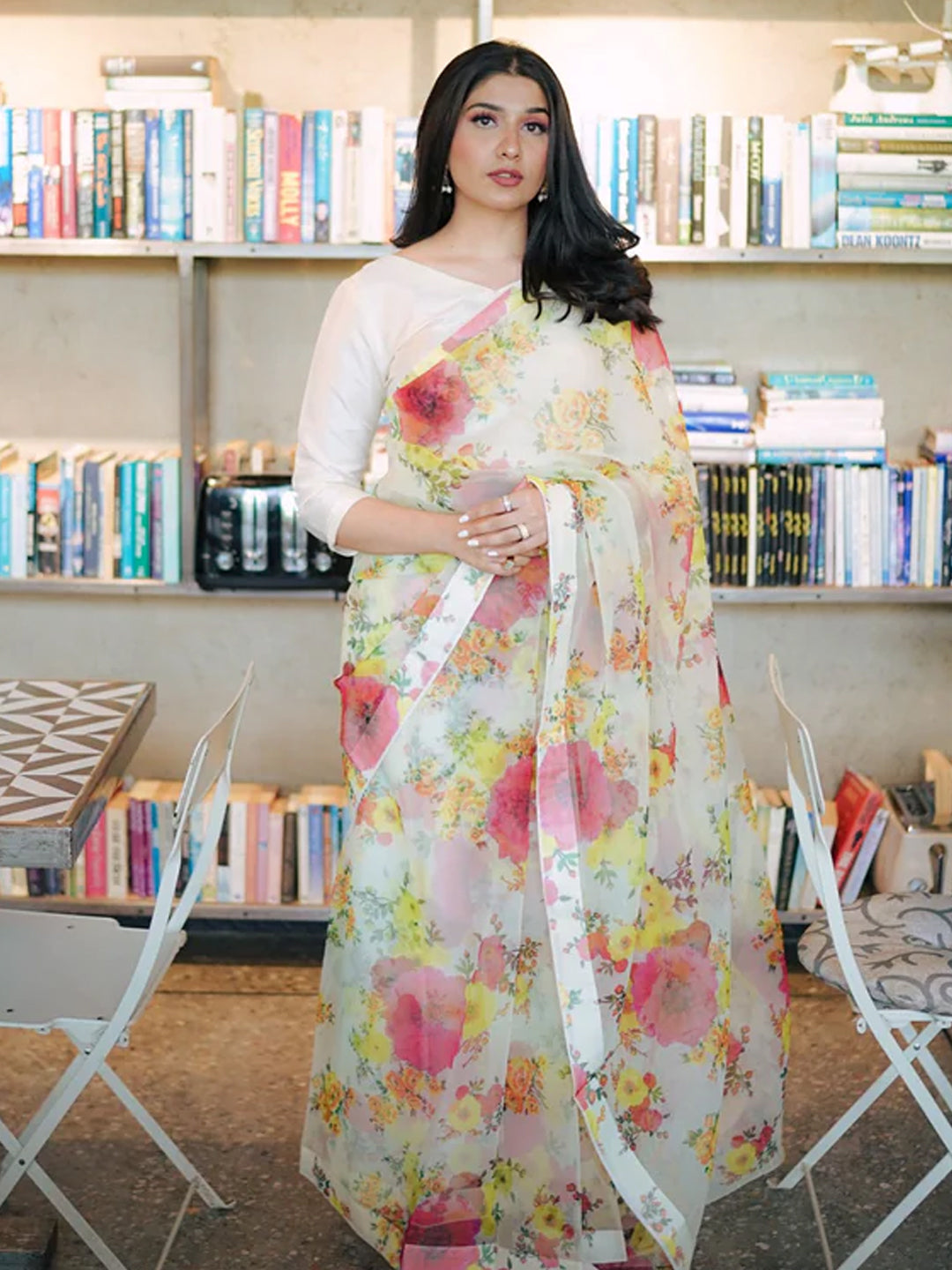 Elegant White Organza Saree - Multicolor Floral Print