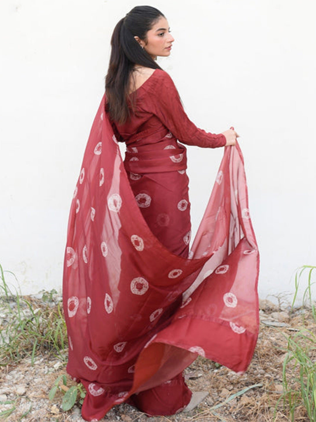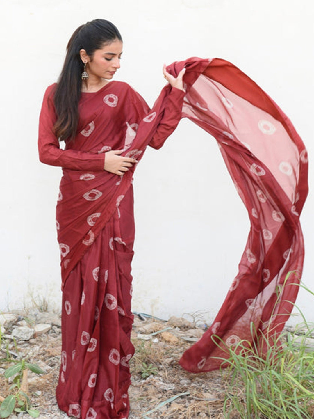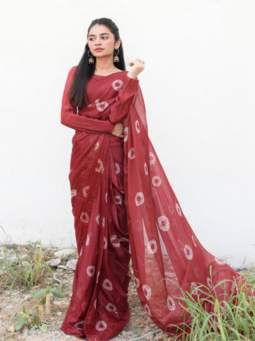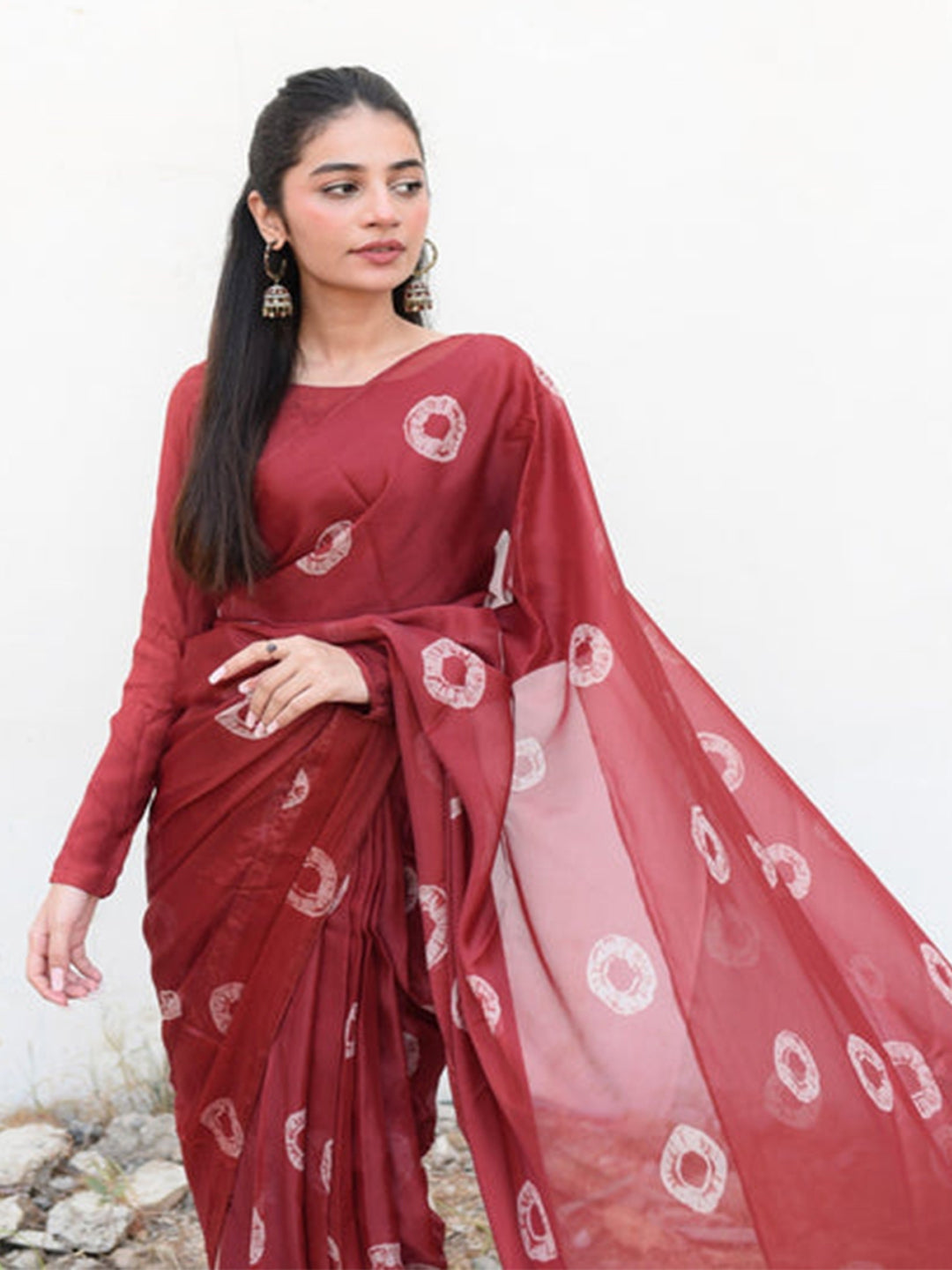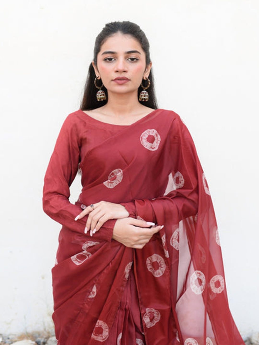 Elevate your ethnic wardrobe with this stunning Maroon Silk Blend Handblock Printed Saree – a perfect blend of simplicity and sophistication. Crafted from lightweight, semi-sheer organza fabric, this saree features subtle circular hand-block print motifs that add a touch of artisanal charm. The solid maroon hue radiates timeless elegance, making it ideal for both minimal festive looks and graceful daily wear.