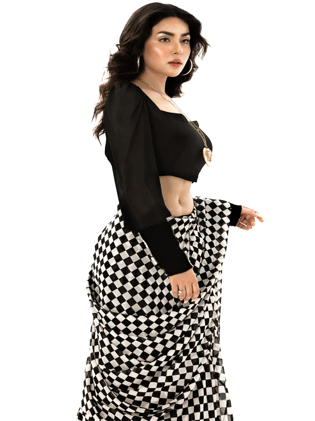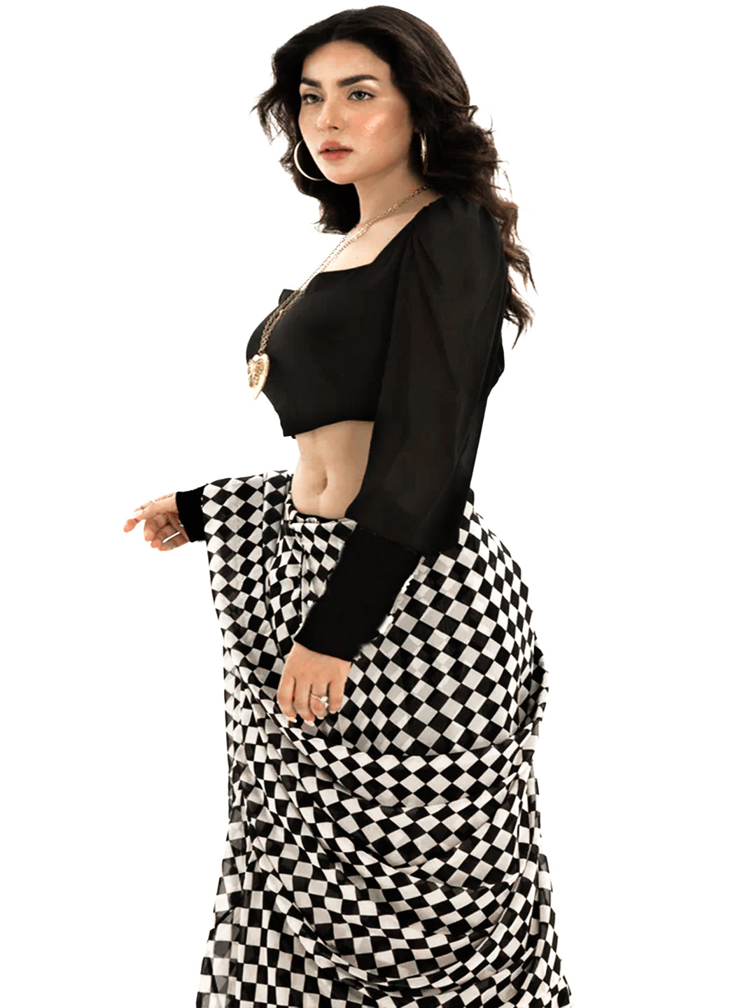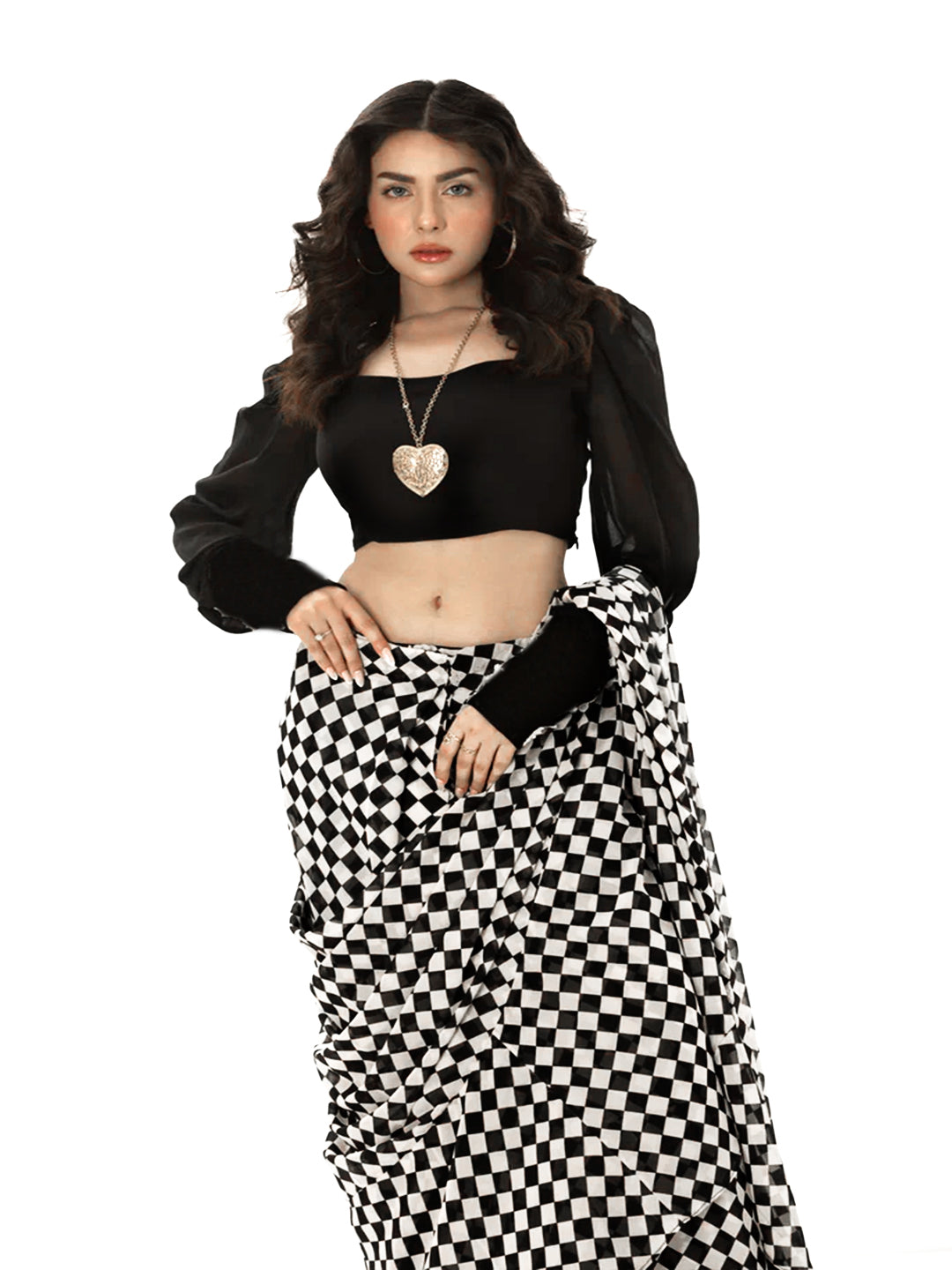 Monochrome Checkered Silk Blend Saree – Lightweight Designer Saree for Parties