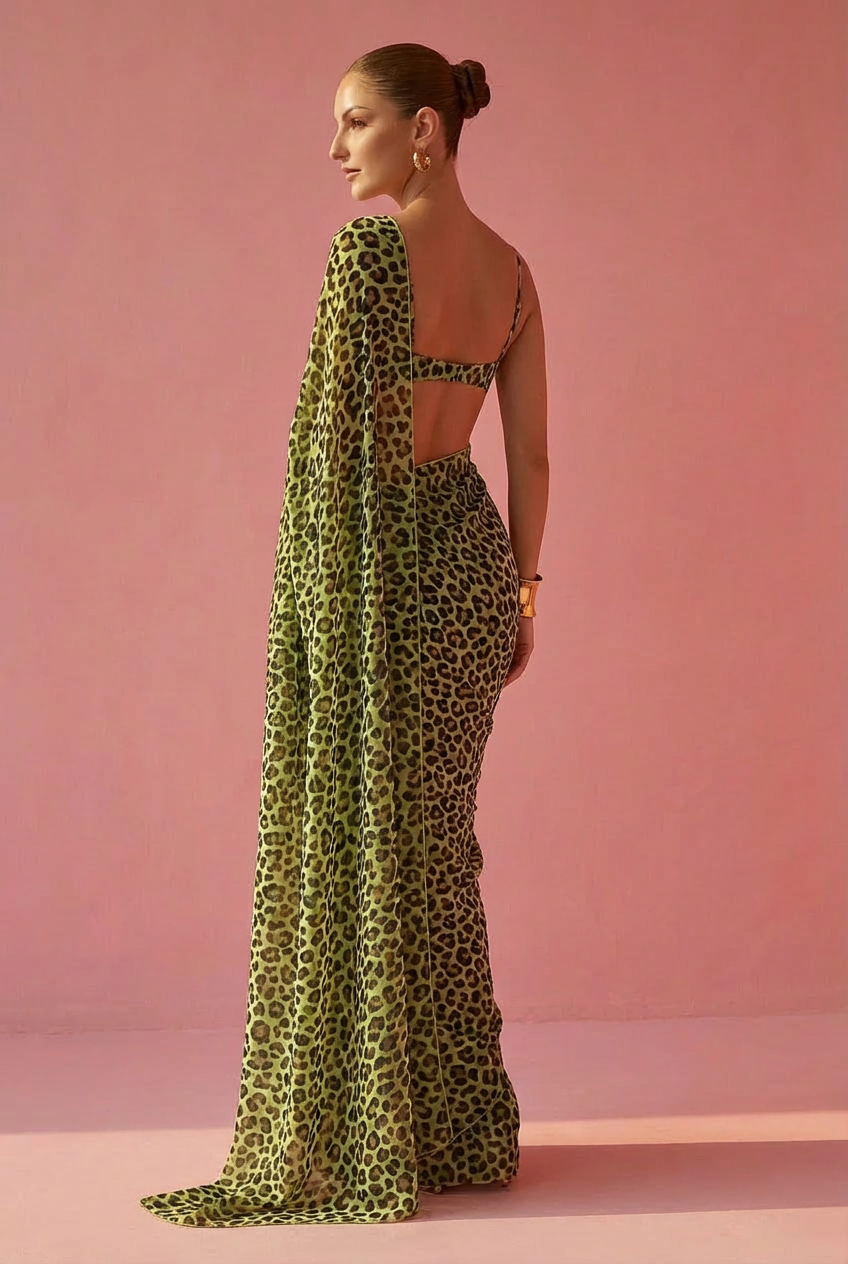 Make an unforgettable fashion statement with this electrifying neon green leopard print silk blend saree. The vibrant neon green base with bold black leopard spots creates a daring, contemporary look that's perfect for the fearless fashionista.