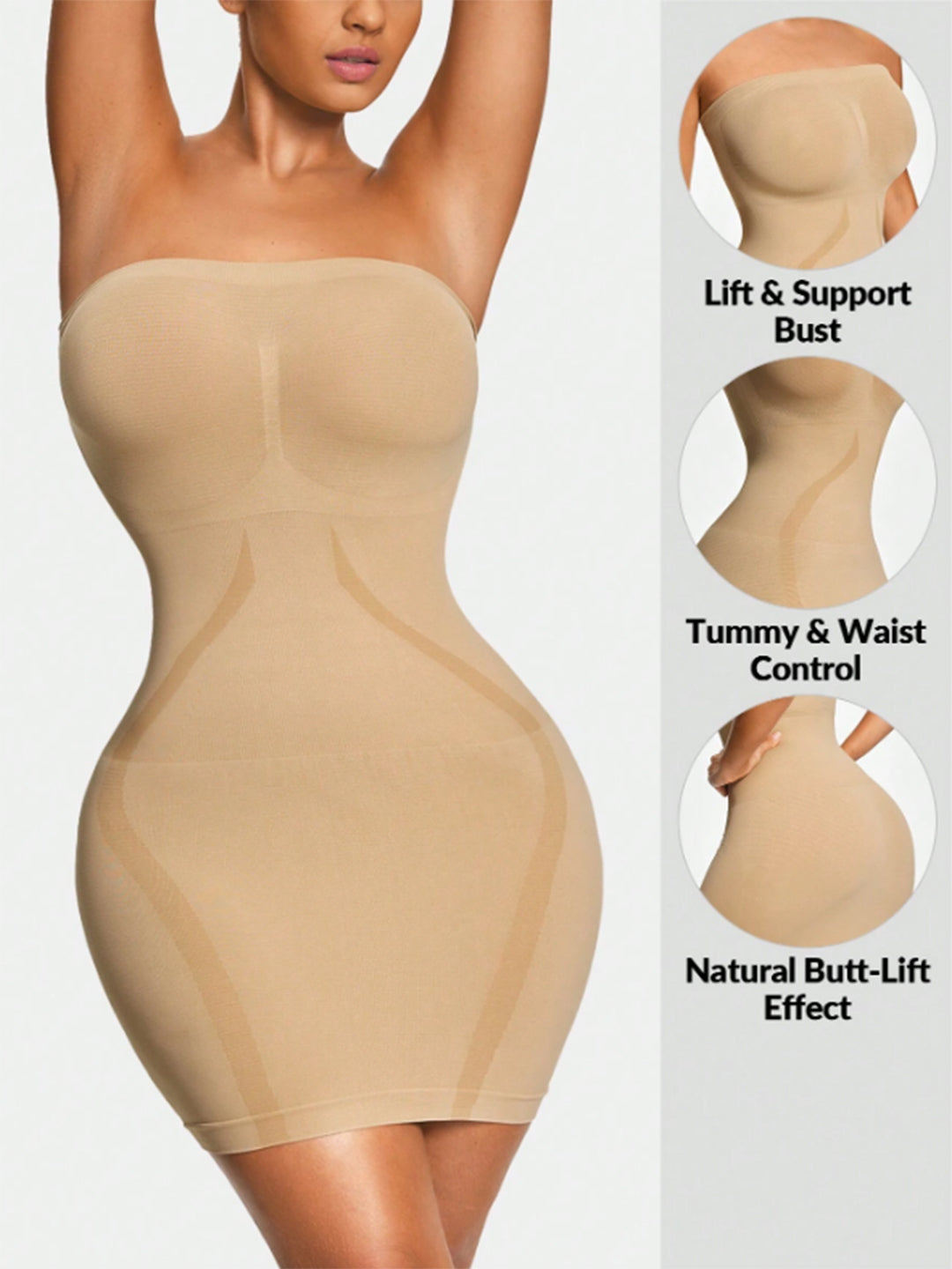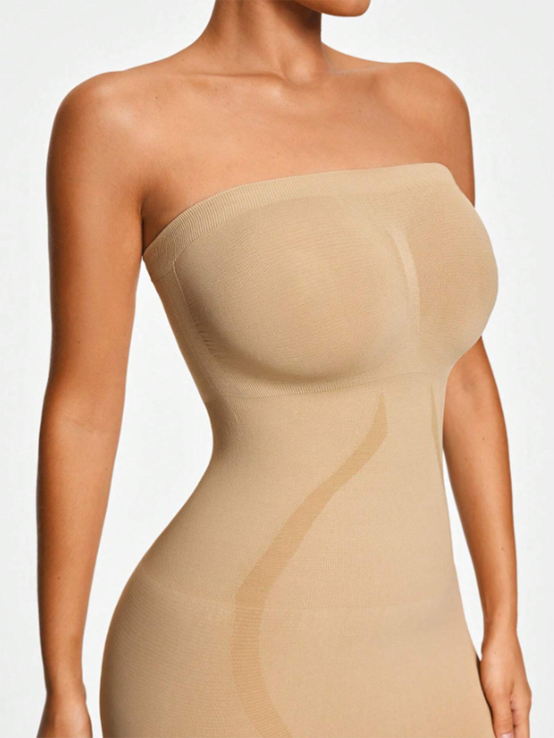 Achieve your most confident silhouette with our nude complete body shaper. Made from premium spandex fabric, this revolutionary strapless shapewear provides comprehensive body transformation with bust lift and support, tummy and waist control, and natural butt-lift effect - all seamlessly integrated into one invisible foundation garment.