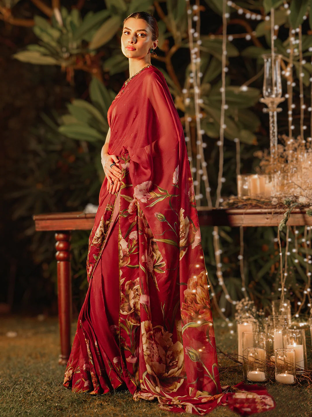 Exquisite Red Floral Print Saree - Timeless Beauty in Rich Crimson