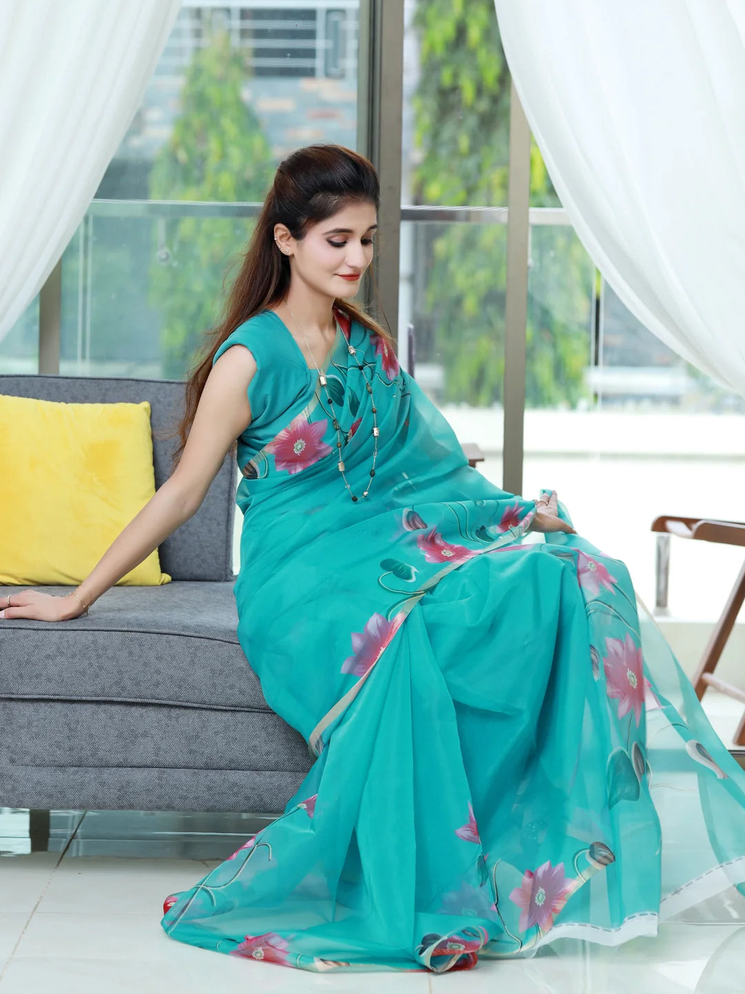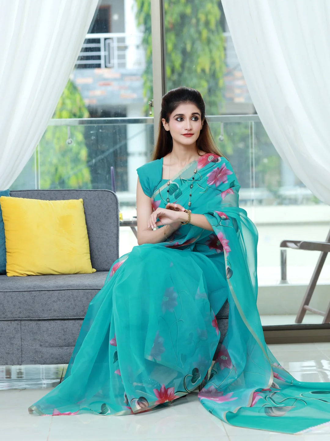 Stunning Peach Turquoise Organza Saree - Floral Print Design