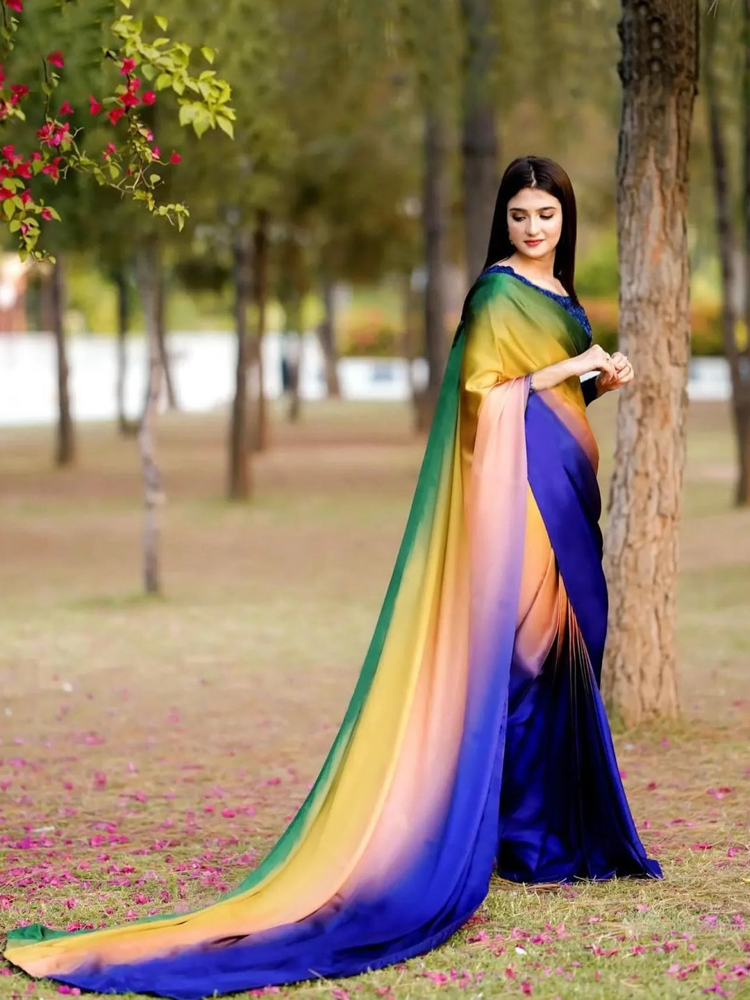 Celebrate life in full color with this spectacular multicolor rainbow gradient satin silk saree that showcases a breathtaking spectrum of hues. This stunning piece features a seamless transition through vibrant blues, purples, pinks, yellows, and greens, creating a mesmerizing rainbow effect that's truly one-of-a-kind.